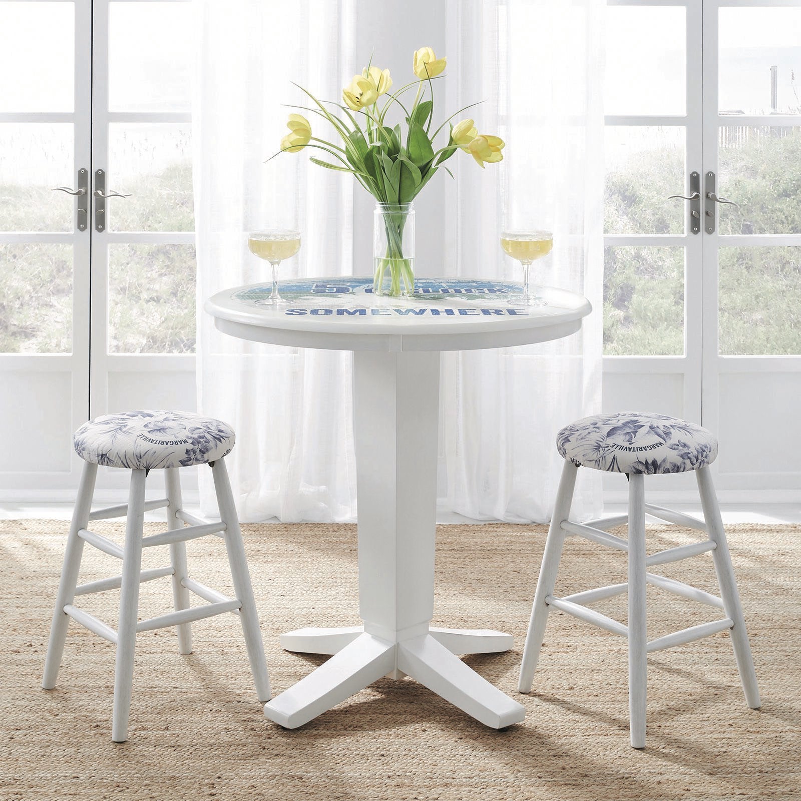 Live the lifestyle with the 36" Margaritaville Dining Table from the Island Reserve Collection. Crafted from hardwood solids and veneers in a breezy painted white finish, this round pedestal table brings a relaxed, coastal vibe to any space. The branded “5 O’Clock Somewhere” tabletop adds a playful, signature touch—perfect for easygoing meals and island-inspired entertaining.