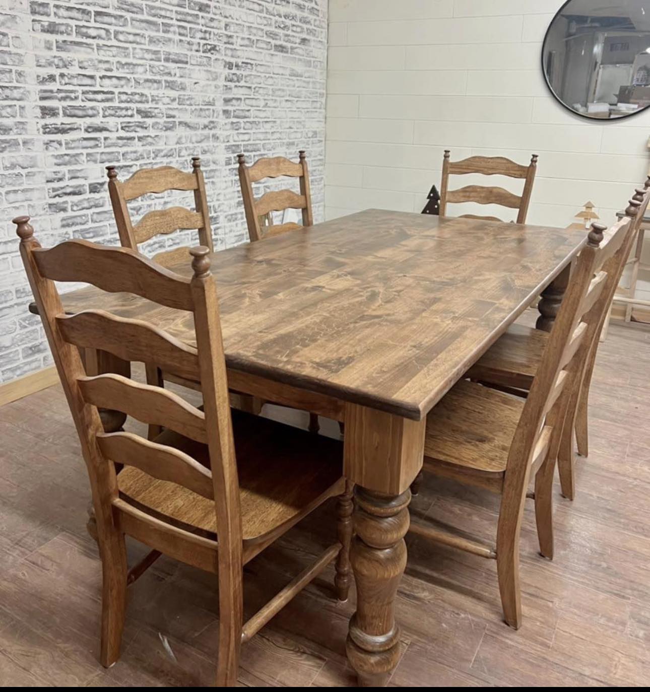 6' L x 42" W Rustic Alder Husky Dining Table with 6 Maine Ladder Back Chairs.